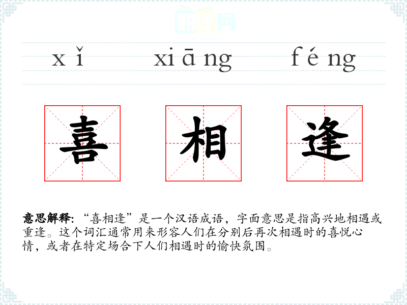 在英语中,类似的表达可能是“happy reunion”或“joyful encounter”,虽然它们传达了相似的情感,但“喜相逢”作为一个成语,其文化内涵和历史背景更为丰富。