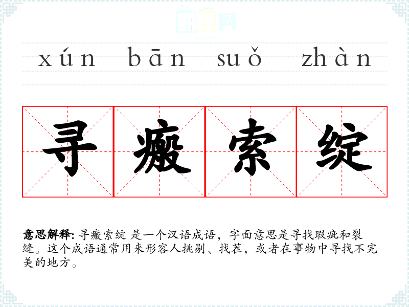 寻瘢索绽 是一个汉语成语,字面意思是寻找瑕疵和裂缝。这个成语通常用来形容人挑剔、找茬,或者在事物中寻找不完美的地方。