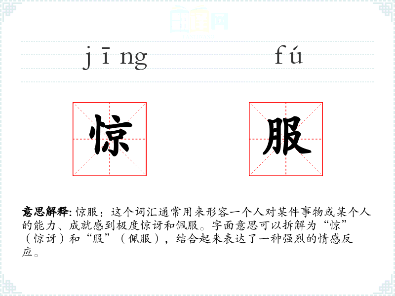 惊服:这个词汇通常用来形容一个人对某件事物或某个人的能力、成就感到极度惊讶和佩服。字面意思可以拆解为“惊”(惊讶)和“服”(佩服),结合起来表达了一种强烈的情感反应。