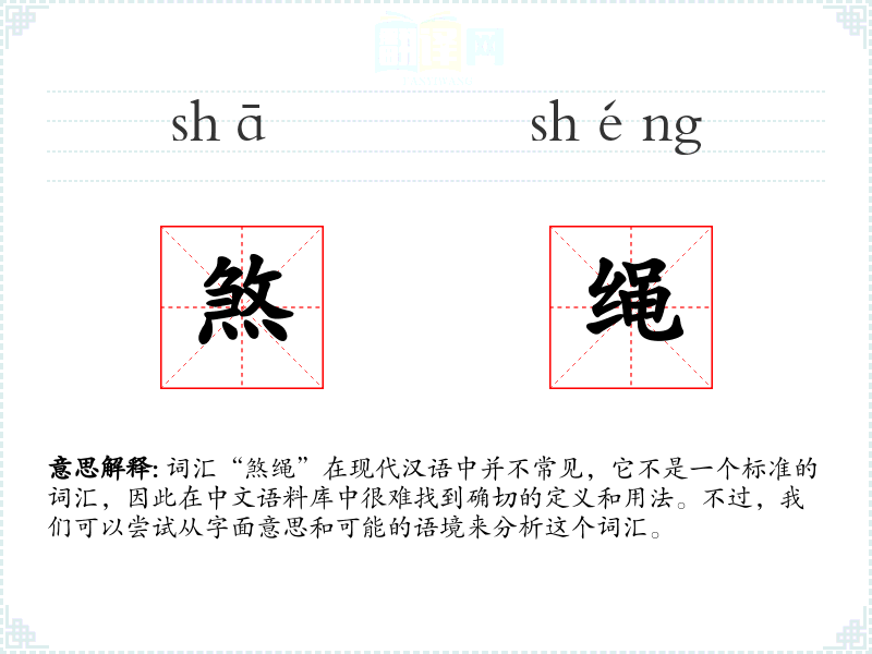 词汇“煞绳”在现代汉语中并不常见,它不是一个标准的词汇,因此在中文语料库中很难找到确切的定义和用法。不过,我们可以尝试从字面意思和可能的语境来分析这个词汇。
