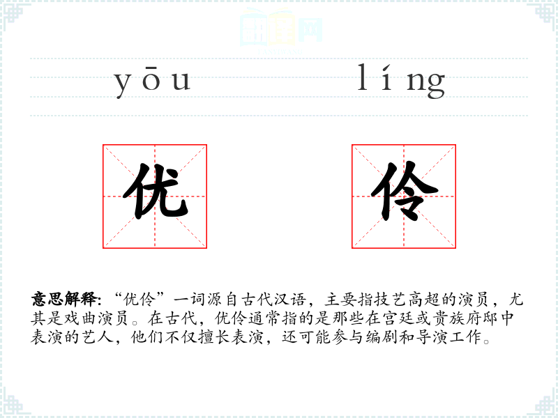 “优伶”一词源自古代汉语,主要指技艺高超的演员,尤其是戏曲演员。在古代,优伶通常指的是那些在宫廷或贵族府邸中表演的艺人,他们不仅擅长表演,还可能参与编剧和导演工作。