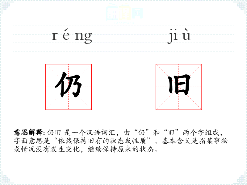 仍旧 是一个汉语词汇,由“仍”和“旧”两个字组成,字面意思是“依然保持旧有的状态或性质”。基本含义是指某事物或情况没有发生变化,继续保持原来的状态。
