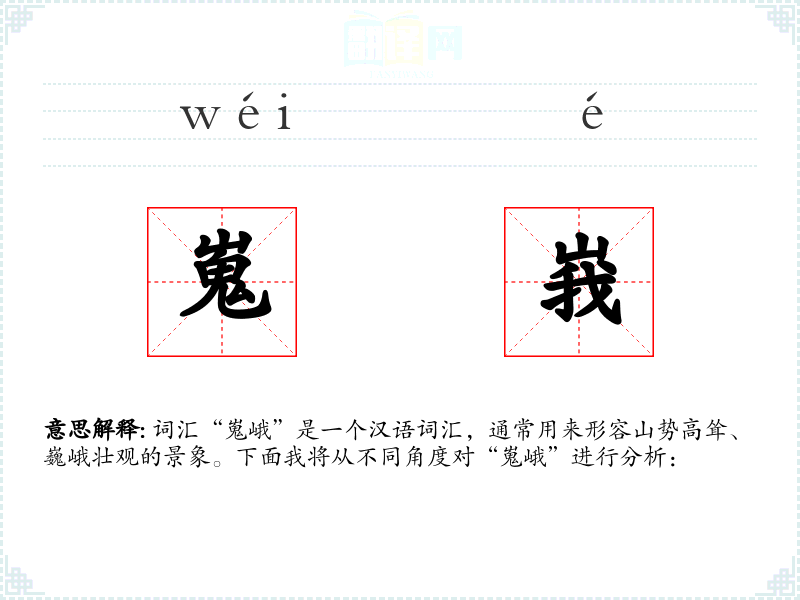 词汇“嵬峨”是一个汉语词汇,通常用来形容山势高耸、巍峨壮观的景象。下面我将从不同角度对“嵬峨”进行分析: