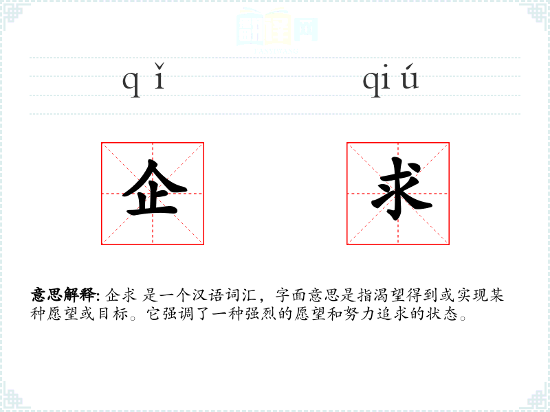 企求 是一个汉语词汇,字面意思是指渴望得到或实现某种愿望或目标。它强调了一种强烈的愿望和努力追求的状态。