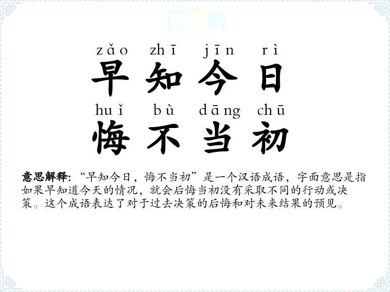 “早知今日,悔不当初”是一个汉语成语,字面意思是指如果早知道今天的情况,就会后悔当初没有采取不同的行动或决策。这个成语表达了对于过去决策的后悔和对未来结果的预见。