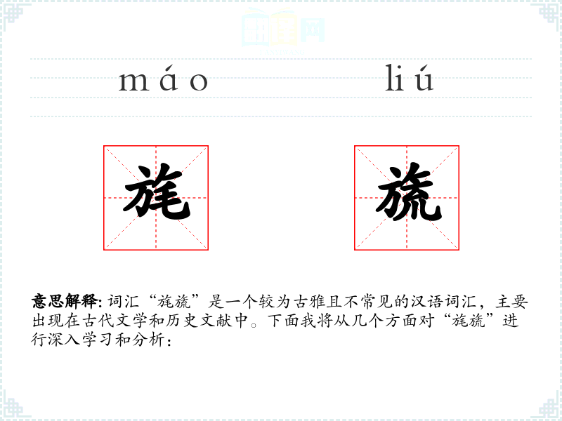 词汇“旄旒”是一个较为古雅且不常见的汉语词汇,主要出现在古代文学和历史文献中。下面我将从几个方面对“旄旒”进行深入学*和分析: