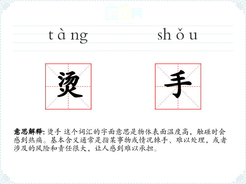 烫手 这个词汇的字面意思是物体表面温度高,触碰时会感到热痛。基本含义通常是指某事物或情况棘手、难以处理,或者涉及的风险和责任很大,让人感到难以承担。