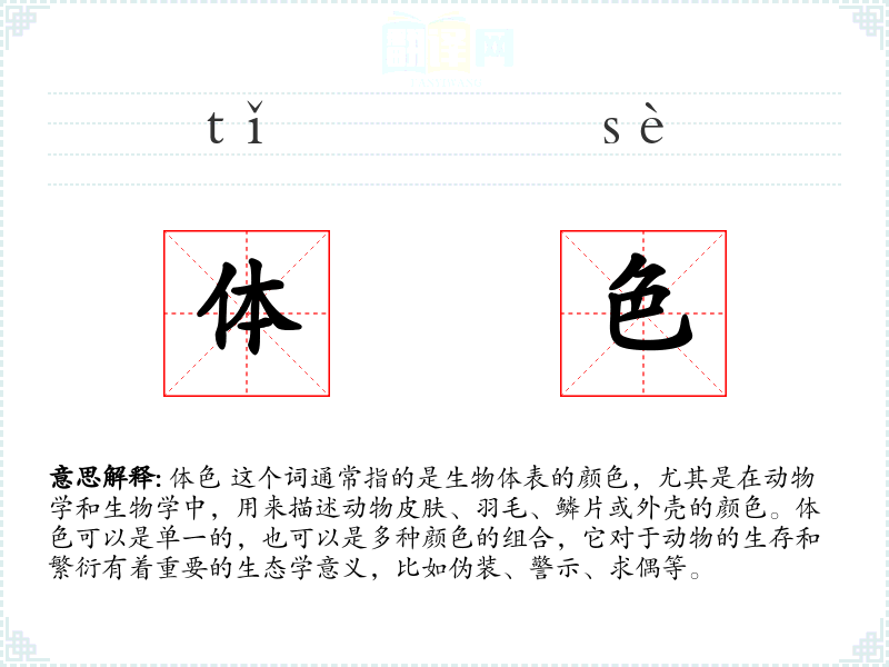 体色 这个词由“体”和“色”两个字组成,其中“体”指的是身体,“色”指的是颜色。在古代汉语中,“色”字已经用来描述颜色,而“体”字则逐渐从指代身体扩展到指代物体的整体。