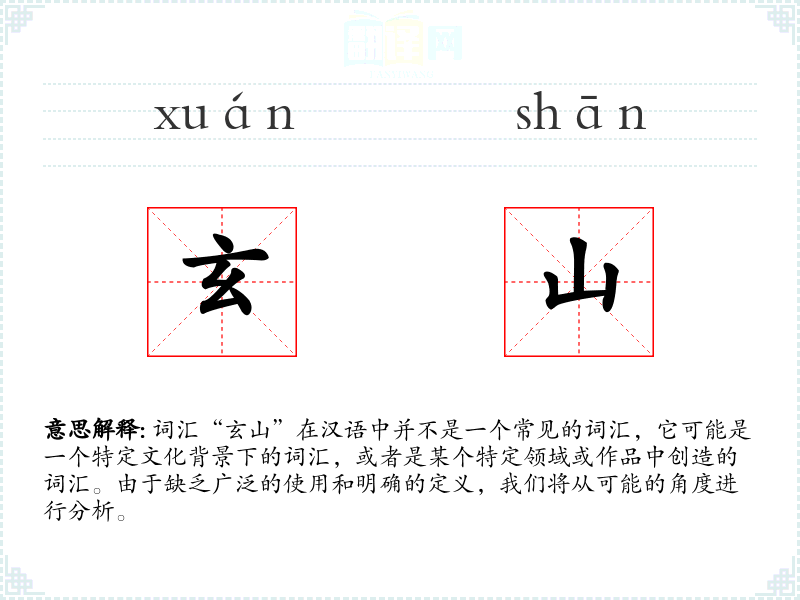 “玄山”字面意思可能指的是一座神秘或深奥的山。其中,“玄”字常用来形容深奥、神秘、不可测的事物,而“山”则是自然界中的地形。