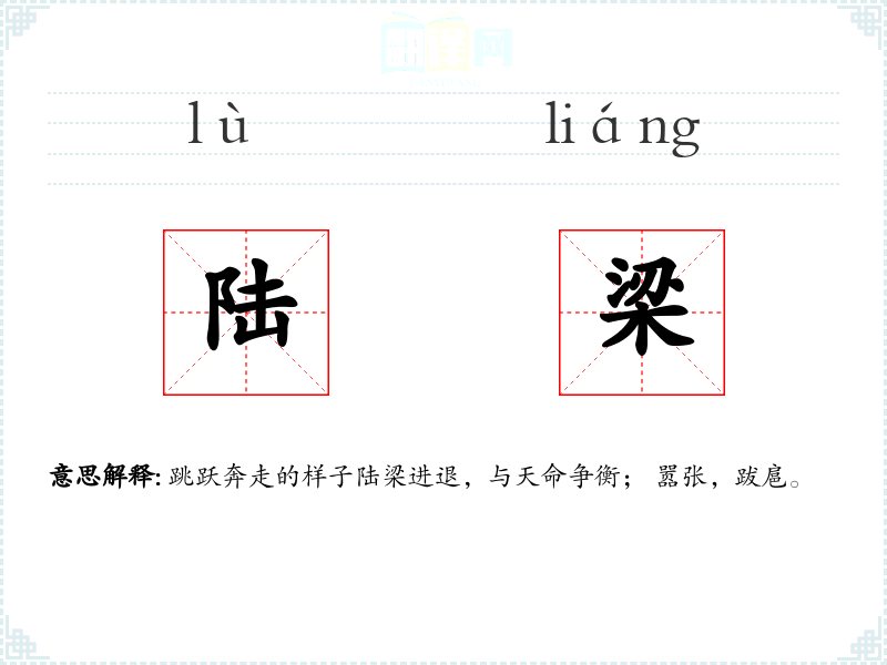 跳跃奔走的样子陆梁进退,与天命争衡; 嚣张,跋扈。