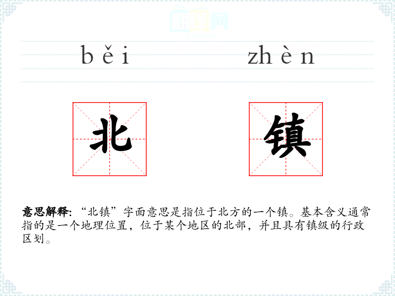 “北镇”字面意思是指位于北方的一个镇。基本含义通常指的是一个地理位置,位于某个地区的北部,并且具有镇级的行政区划。