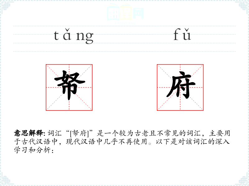 词汇“[帑府]”是一个较为古老且不常见的词汇,主要用于古代汉语中,现代汉语中几乎不再使用。以下是对该词汇的深入学*和分析: