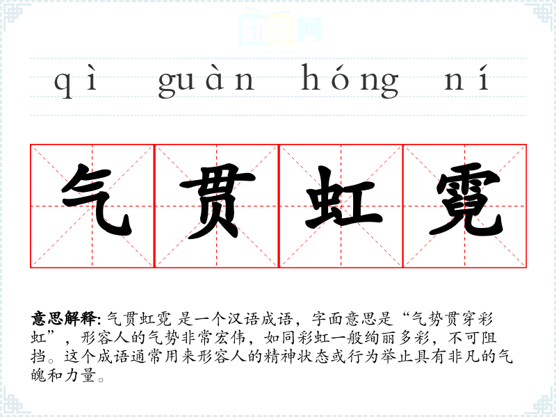 气贯虹霓 是一个汉语成语,字面意思是“气势贯穿彩虹”,形容人的气势非常宏伟,如同彩虹一般绚丽多彩,不可阻挡。这个成语通常用来形容人的精神状态或行为举止具有非凡的气魄和力量。