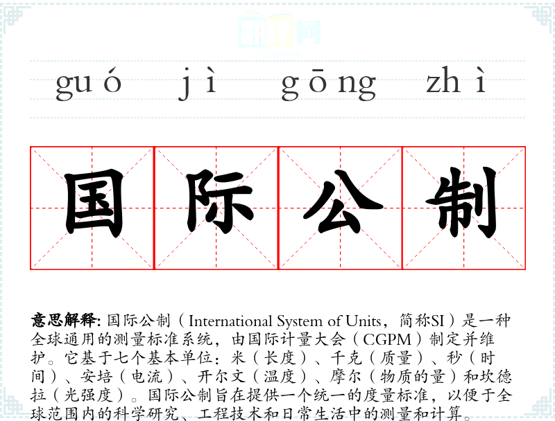国际公制(International System of Units,简称SI)是一种全球通用的测量标准系统,由国际计量大会(CGPM)制定并维护。它基于七个基本单位:米(长度)、千克(质量)、秒(时间)、安培(电流)、开尔文(温度)、摩尔(物质的量)和坎德拉(光强度)。国际公制旨在提供一个统一的度量标准,以便于全球范围内的科学研究、工程技术和日常生活中的测量和计算。