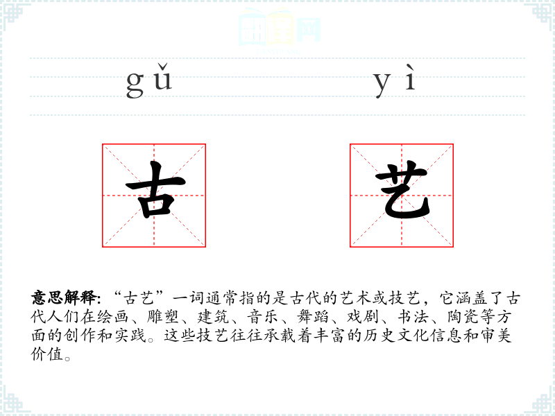 “古艺”一词由“古”和“艺”两个字组成。“古”指古代,“艺”指技艺或艺术。在汉语中,“艺”字最早见于甲骨文,原意为种植,后引申为技能、才能。随着时间的推移,“古艺”逐渐成为指代古代艺术和技艺的专有词汇。