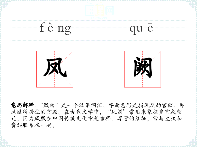 “凤阙”一词源于**古代的神话传说和宫廷文化。凤凰作为神话中的神鸟,象征着吉祥和美好,因此与皇宫联系在一起。随着时间的推移,“凤阙”逐渐成为皇宫的代名词,并在文学作品中广泛使用。