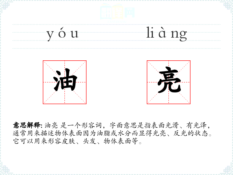 油亮 是一个形容词,字面意思是指表面光滑、有光泽,通常用来描述物体表面因为油脂或水分而显得光亮、反光的状态。它可以用来形容皮肤、头发、物体表面等。