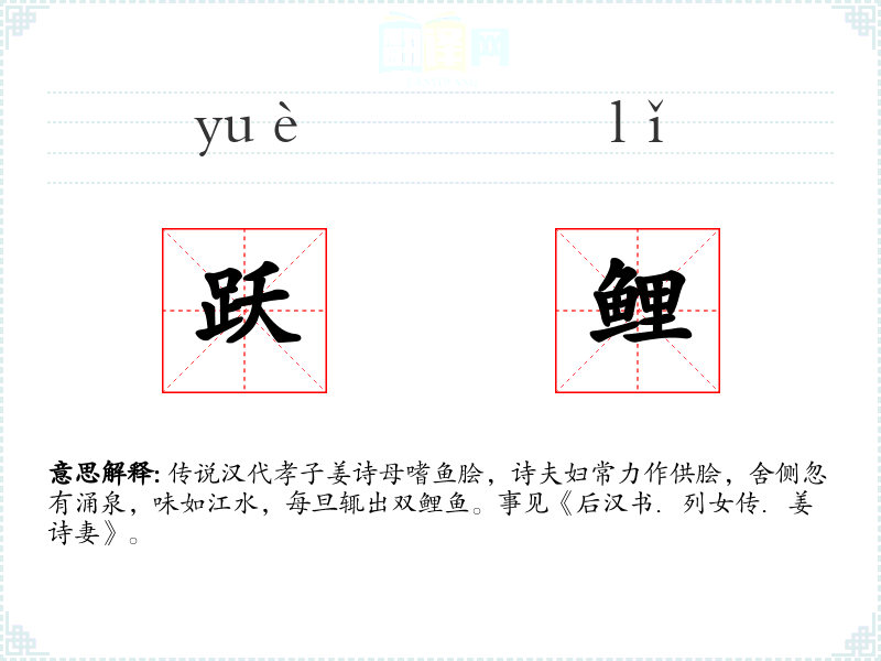传说汉代孝子姜诗母嗜鱼脍,诗夫妇常力作供脍,舍侧忽有涌泉,味如江水,每旦辄出双鲤鱼。事见《后汉书.列女传.姜诗妻》。
