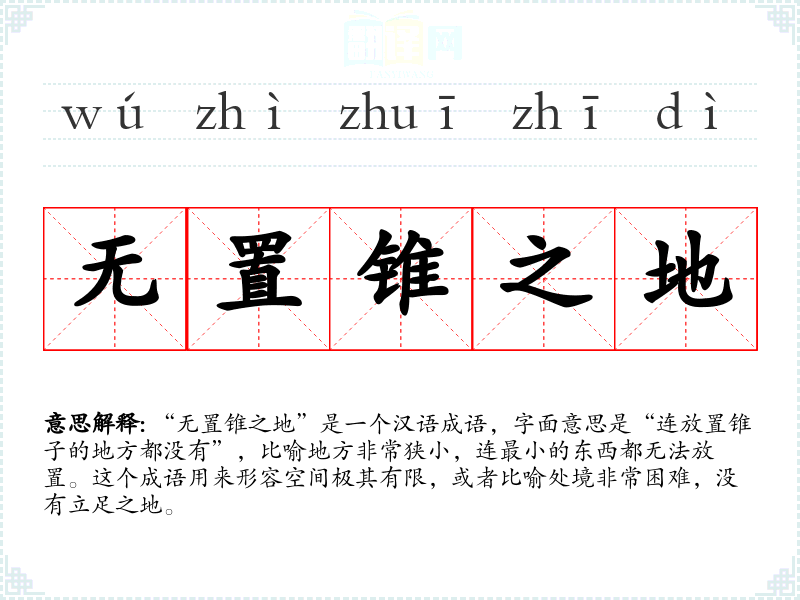 “无置锥之地”出自《左传·宣公十五年》:“无置锥之地,而有聚敛之臣。”原意是指连放置锥子的地方都没有,后来逐渐演变为形容地方极其狭小或处境极其困难的成语。