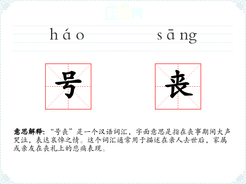 “号丧”是一个汉语词汇,字面意思是指在丧事期间大声哭泣,表达哀悼之情。这个词汇通常用于描述在亲人去世后,家属或亲友在丧礼上的悲痛表现。