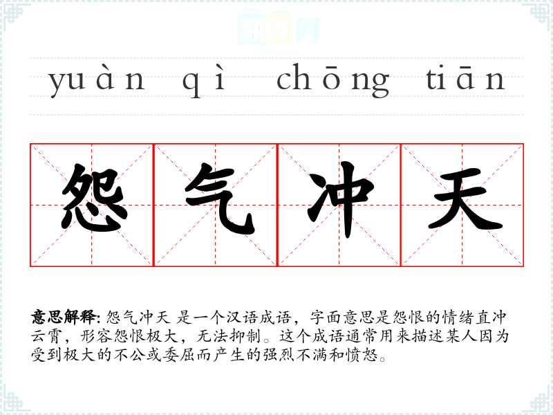 怨气冲天 是一个汉语成语,字面意思是怨恨的情绪直冲云霄,形容怨恨极大,无法抑制。这个成语通常用来描述某人因为受到极大的不公或委屈而产生的强烈不满和愤怒。