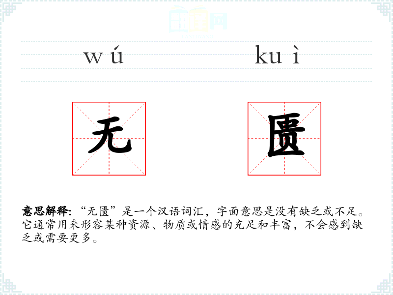 “无匮”由“无”和“匮”两个字组成。“无”表示否定,“匮”原指箱子,后引申为缺乏、不足。在古代文献中,“无匮”常用来形容国家的财富和物资充足,如《左传》中有“国无匮粮”的记载。