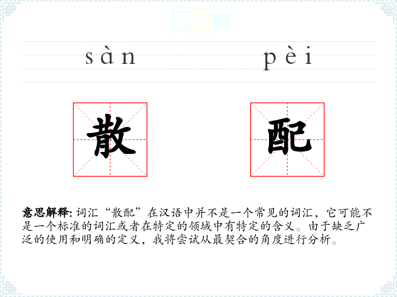 由于“散配”不是一个标准词汇,我们无法给出一个确切的字面意思和基本含义。它可能是由“散”和“配”两个字组合而成的,其中“散”可能指的是分散、零散,而“配”可能指的是搭配、配合。因此,“散配”可能指的是零散地搭配或分散地配合。