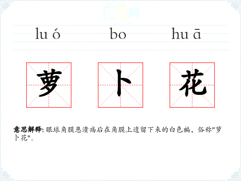 眼球角膜患溃疡后在角膜上遗留下来的白色褊,俗称"萝卜花"。