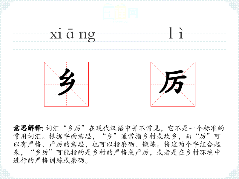 同义词方面,如果“乡厉”指的是乡村的严格或严厉,可能的同义词包括“乡规”、“乡约”等,这些词汇都与乡村的规矩或约束有关。反义词则可能包括“乡和”、“乡乐”等,这些词汇表达了乡村的和谐与快乐。