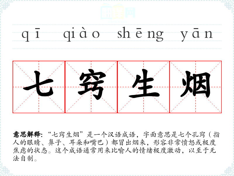 “七窍生烟”是一个汉语成语,字面意思是七个孔窍(指人的眼睛、鼻子、耳朵和嘴巴)都冒出烟来,形容非常愤怒或极度焦虑的状态。这个成语通常用来比喻人的情绪极度激动,以至于无法自制。