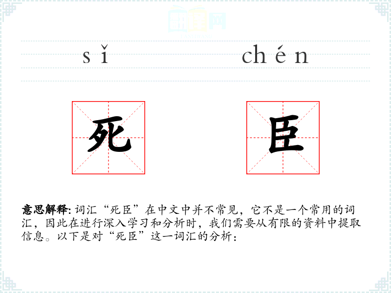 词汇“死臣”在中文中并不常见,它不是一个常用的词汇,因此在进行深入学*和分析时,我们需要从有限的资料中提取信息。以下是对“死臣”这一词汇的分析: