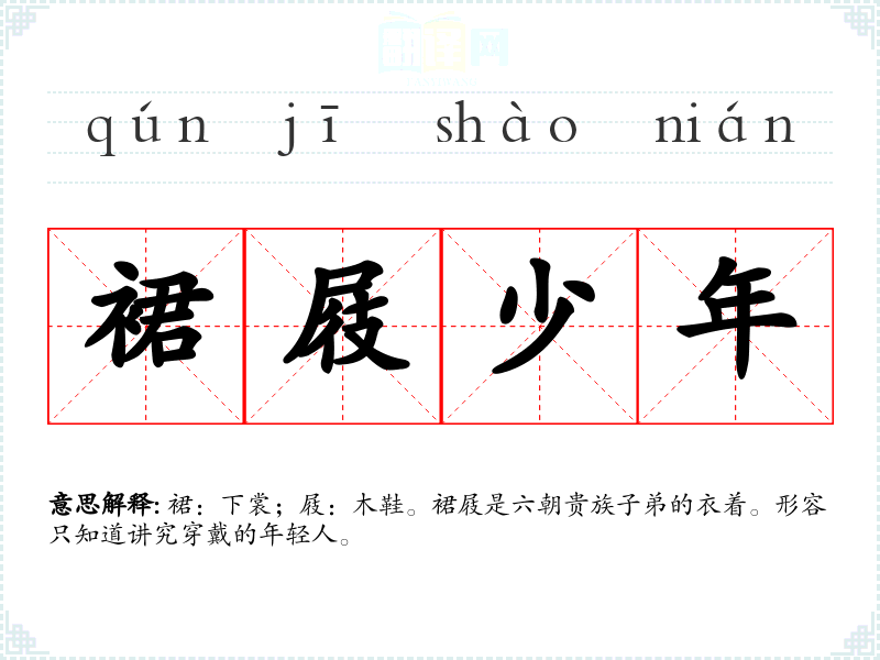 裙:下裳;屐:木鞋。裙屐是六朝贵族子弟的衣着。形容只知道讲究穿戴的年轻人。