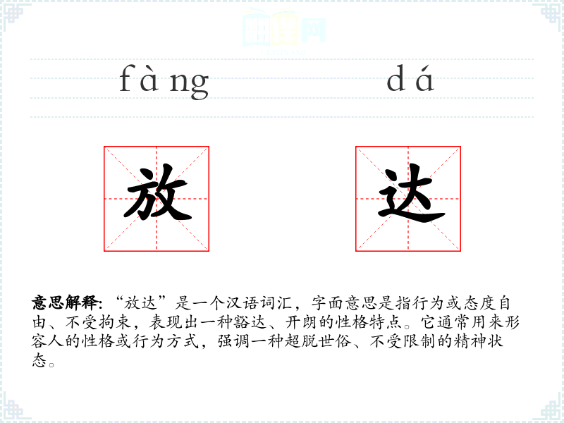 “放达”是一个汉语词汇,字面意思是指行为或态度自由、不受拘束,表现出一种豁达、开朗的性格特点。它通常用来形容人的性格或行为方式,强调一种超脱世俗、不受限制的精神状态。