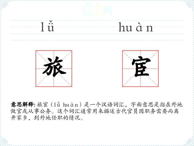 同义词:宦游(huàn yóu),指官员在外地任职或游历。 反义词:家居(jiā jū),指在家居住,与旅宦形成对比。