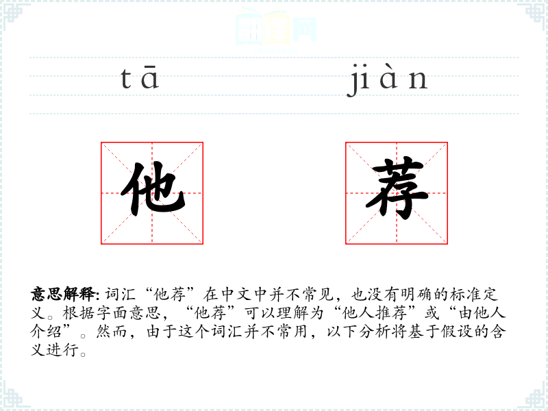 词汇“他荐”在中文中并不常见,也没有明确的标准定义。根据字面意思,“他荐”可以理解为“他人推荐”或“由他人介绍”。然而,由于这个词汇并不常用,以下分析将基于假设的含义进行。