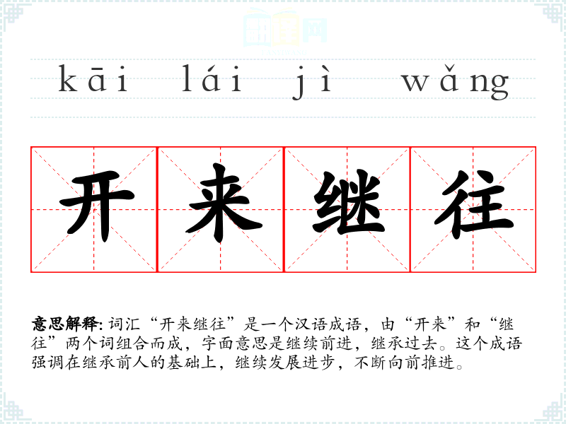 “开来继往”的基本含义是在继承和发扬前人成果的基础上,继续推动事物向前发展。它体现了对传统的尊重和对未来的积极态度。