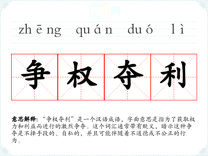 “争权夺利”是一个汉语成语,字面意思是指为了获取权力和利益而进行的激烈争夺。这个词汇通常带有贬义,暗示这种争夺是不择手段的、自私的,并且可能伴随着不道德或不公正的行为。