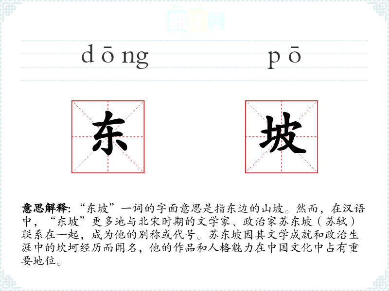 - 口语语境:在日常对话中,提到“东坡”可能是在谈论苏东坡的生平、作品或与之相关的文化现象。