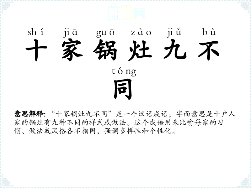 “十家锅灶九不同”是一个汉语成语,字面意思是十户人家的锅灶有九种不同的样式或做法。这个成语用来比喻每家的*惯、做法或风格各不相同,强调多样性和个性化。