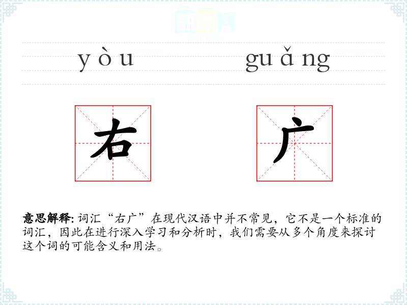 由于“右广”不是一个标准的汉语词汇,我们无法给出一个确切的字面意思和基本含义。它可能是某个特定领域或方言中的词汇,或者是某个特定历史时期的用语。