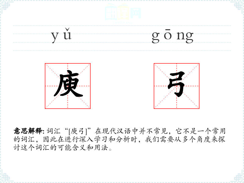 词汇“[庾弓]”在现代汉语中并不常见,它不是一个常用的词汇,因此在进行深入学*和分析时,我们需要从多个角度来探讨这个词汇的可能含义和用法。