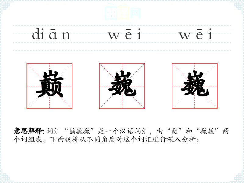 - 词源:“巅”源自古代汉语,意为山的顶峰;“巍巍”也是古代汉语,形容高大雄伟。