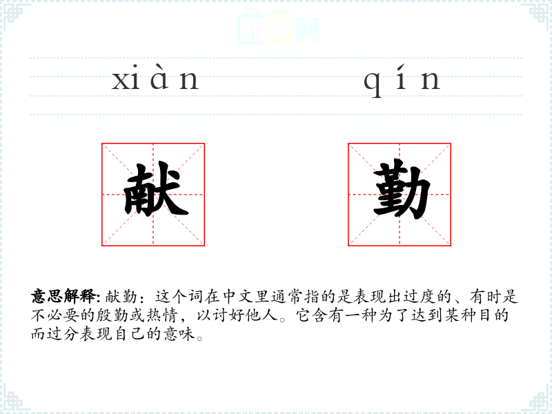 献勤:这个词在中文里通常指的是表现出过度的、有时是不必要的殷勤或热情,以讨好他人。它含有一种为了达到某种目的而过分表现自己的意味。