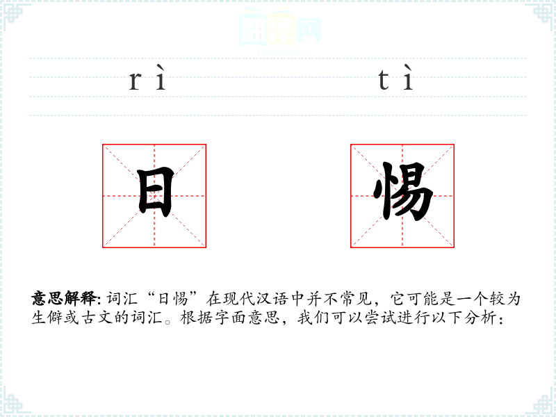 词汇“日惕”在现代汉语中并不常见,它可能是一个较为生僻或古文的词汇。根据字面意思,我们可以尝试进行以下分析: