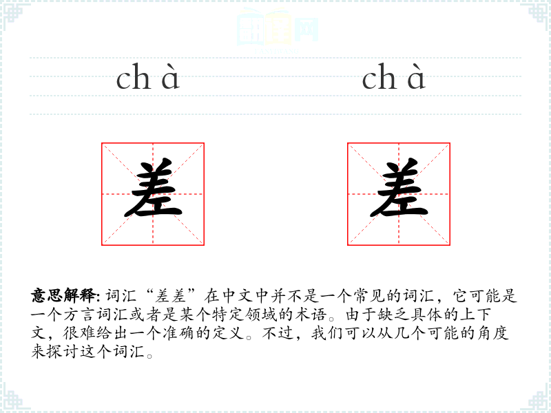 词汇“差差”在中文中并不是一个常见的词汇,它可能是一个方言词汇或者是某个特定领域的术语。由于缺乏具体的上下文,很难给出一个准确的定义。不过,我们可以从几个可能的角度来探讨这个词汇。