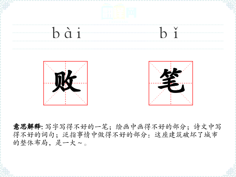 写字写得不好的一笔;绘画中画得不好的部分;诗文中写得不好的词句;泛指事情中做得不好的部分:这座建筑破坏了城市的整体布局,是一大~。