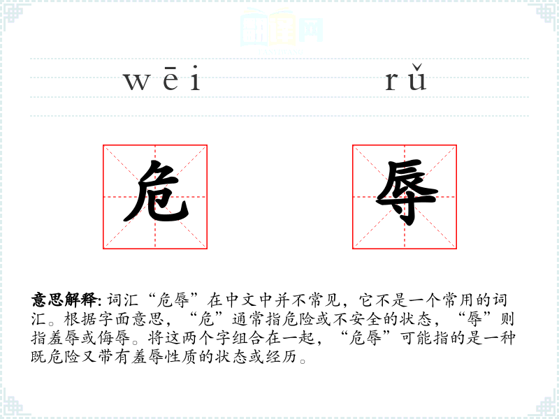 词汇“危辱”在中文中并不常见,它不是一个常用的词汇。根据字面意思,“危”通常指危险或不安全的状态,“辱”则指羞辱或侮辱。将这两个字组合在一起,“危辱”可能指的是一种既危险又带有羞辱性质的状态或经历。