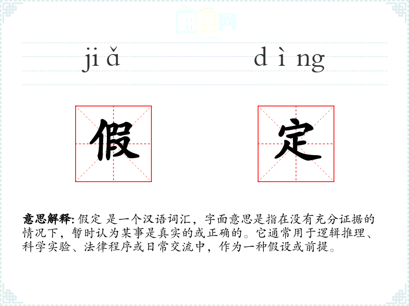 假定 是一个汉语词汇,字面意思是指在没有充分证据的情况下,暂时认为某事是真实的或正确的。它通常用于逻辑推理、科学实验、法律程序或日常交流中,作为一种假设或前提。