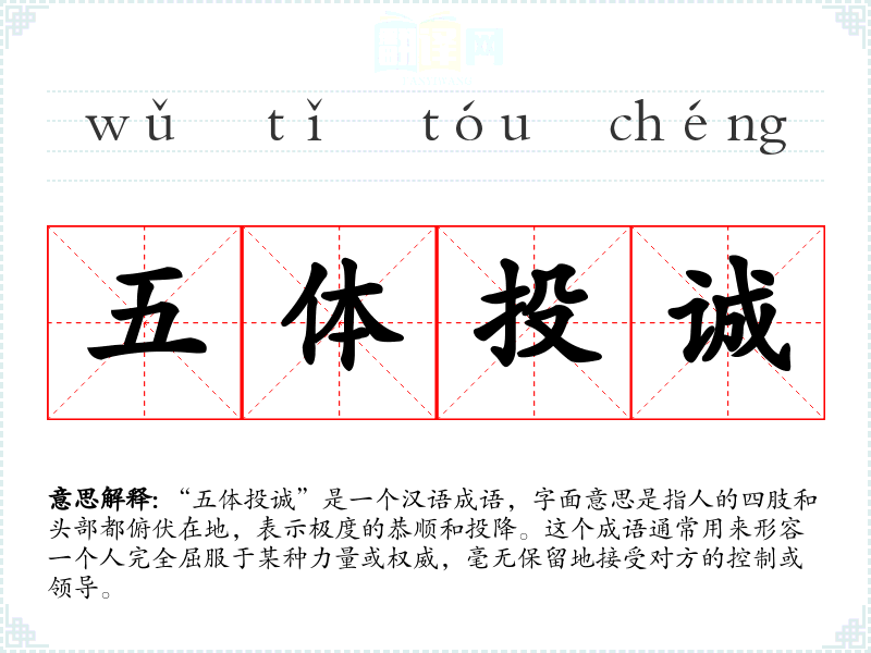 “五体投诚”是一个汉语成语,字面意思是指人的四肢和头部都俯伏在地,表示极度的恭顺和投降。这个成语通常用来形容一个人完全屈服于某种力量或权威,毫无保留地接受对方的控制或领导。