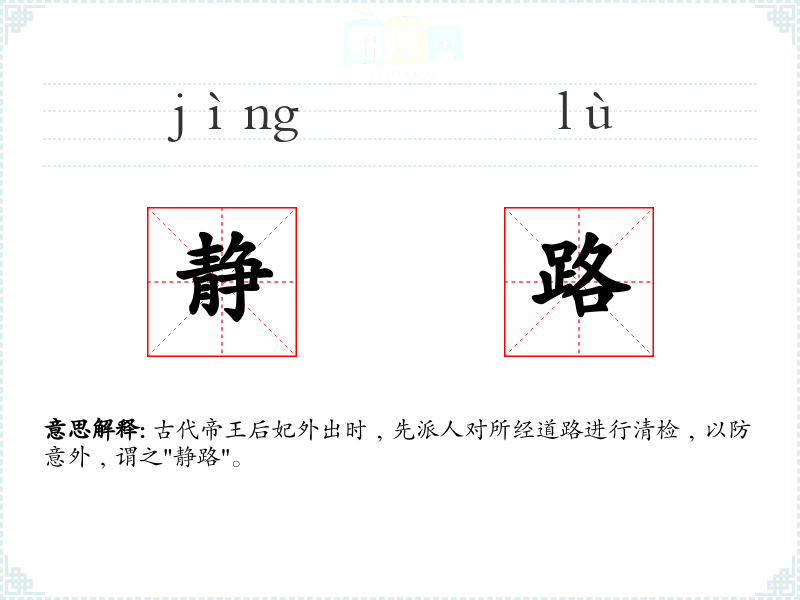 古代帝王后妃外出时﹐先派人对所经道路进行清检﹐以防意外﹐谓之"静路"。